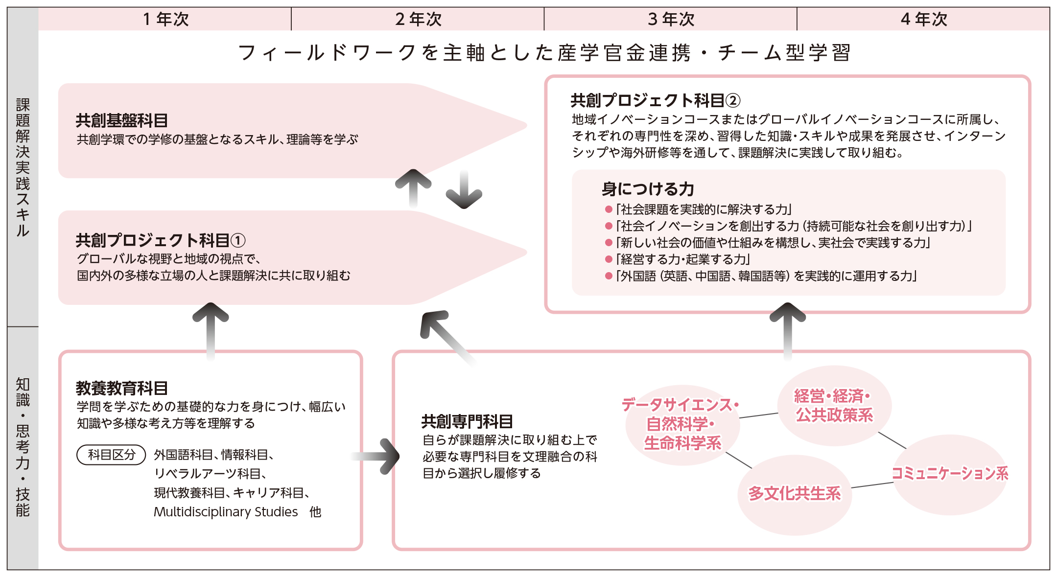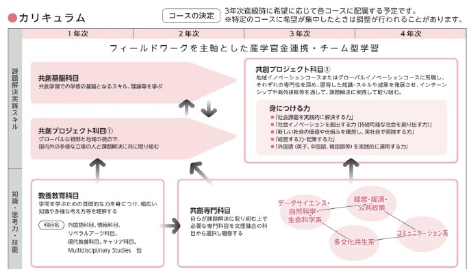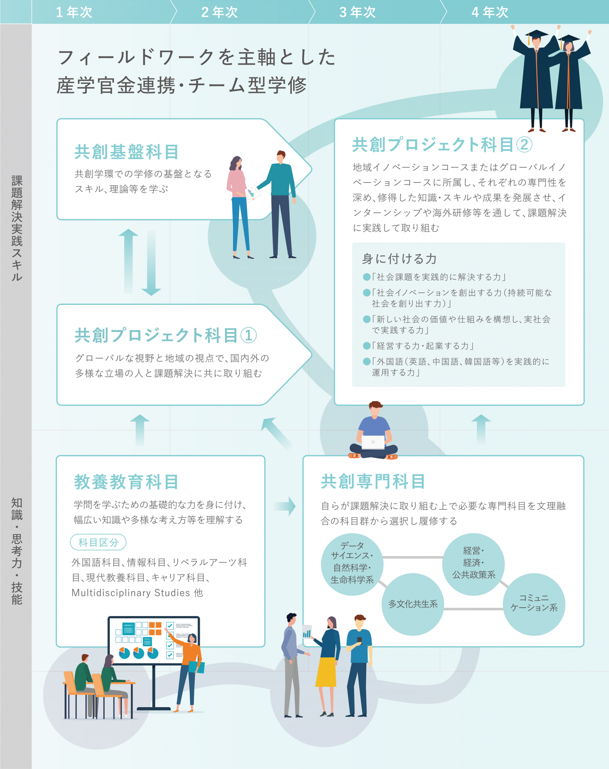 共創実践論Iでは、人口減少や地域課題をテーマに、異なる専門性を持つ講師陣による講義を通じて、 持続可能な社会の実現に向けた地域課題の解決方法を学びます。 多様なアプローチや事例分析を交え、課題解決に必要な知識とスキルを身につけます。 また、グローバルな視点を取り入れたコンテンツも含まれており、国際的な課題意識も育成します。 共創実践論Ⅱでは、人口減少や地域課題に対する具体的な解決策を探求し、 多角的視点から課顆分析とアプローチ方法を深く学びます。 また、グローバルコンテンツを取り入れ、国際的な視点を持った問題解決力を養成します。 実践的な議論やケーススタディを通じて、共創の場を形成するための知識と応用力を高め、社会課題への対応力を強化します。