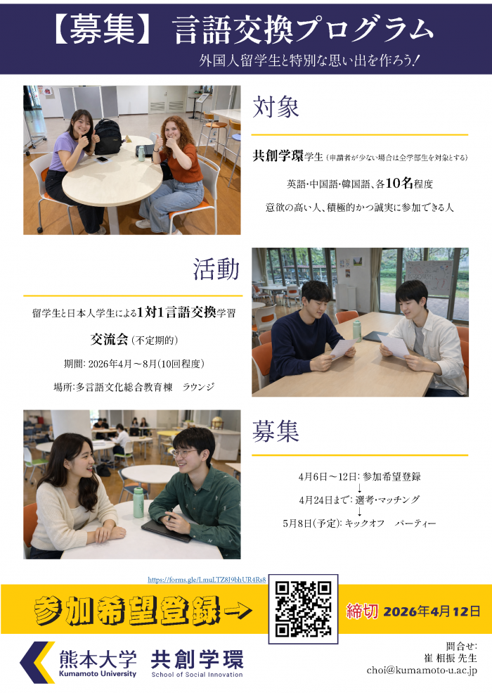 令和8年度4月~10月、共創学環の学生を対象に、言語交換学習プログラムを実施します。